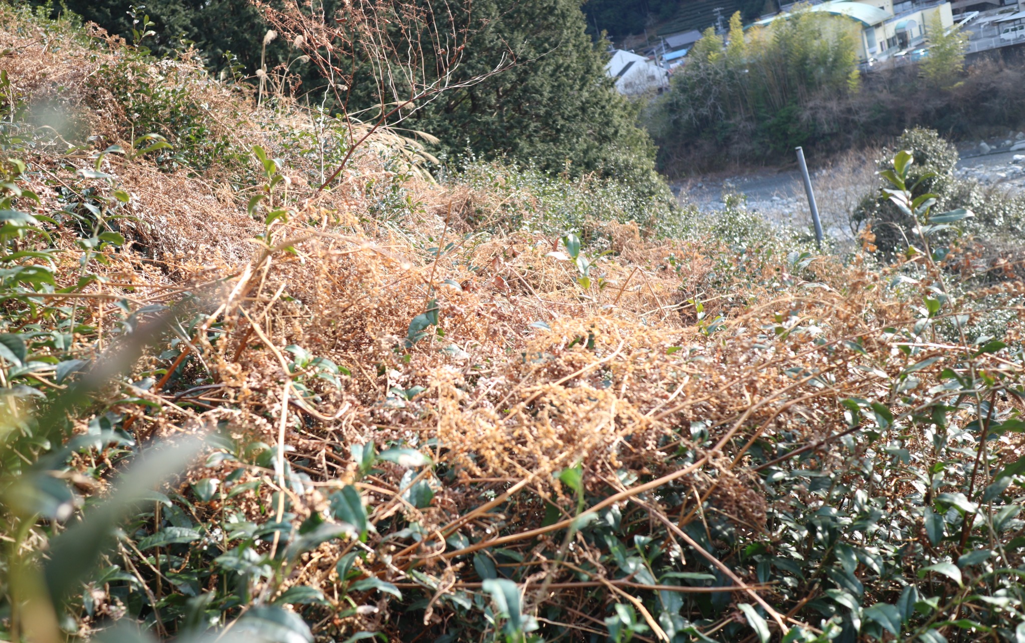 お茶の木はボーボーで、その上に枯れた雑草(主にわらび)が覆いかぶさっています。